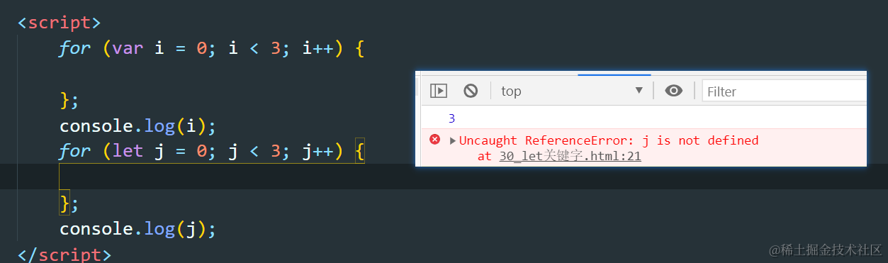 - 在一个大括号中,使用let关键字能形成一个块级作用域,var则不行,除非var在function作用域中。