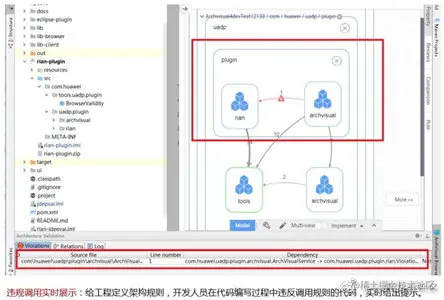 在前面可视化架构的基础上,通过对架构的依赖关系的合法性(设计约束)进行打标签,标注哪些架构依赖是允许的,哪些是不允许的。当开发人员在编码的过程中,出现违反架构设计约束的情况,架构视图立刻出现红线预警,同时给出告警信息,从代码产生的源头上防止架构腐化。