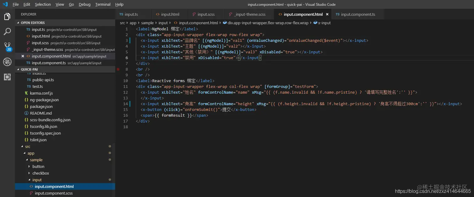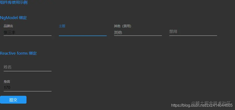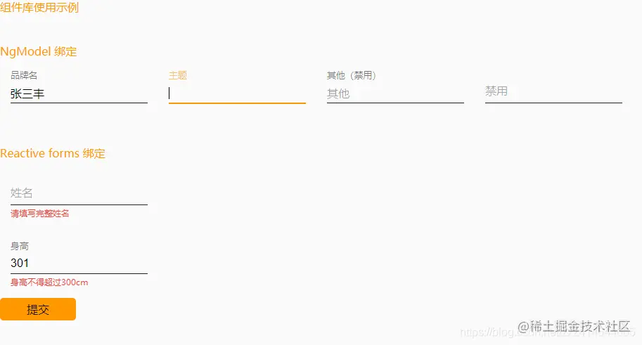 这篇我们自定义input输入框组件,同样支持NgModel和reactive forms,支持验证自定义message提醒,支持浮动label,支持自定义主题色等。