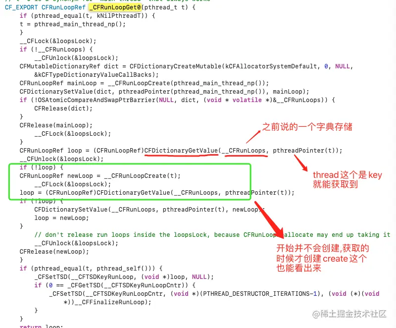 从字典也能看出来是一对一的关系.而且确实是第一次获取的时候是空的,然后再去创建这个RunLoop.