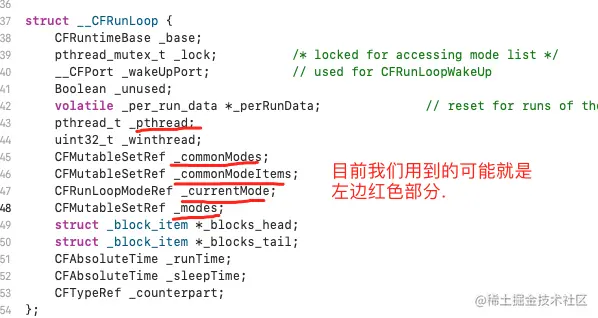 就是上面这个结构体,我们用到的可能就是红色这些.pthread是线程,每个runloop都会保存这个东西.最后面那个_modes,这个是个集合来着,CFMutableSetRef我们能想到我们自己用的set也是一个集合来着,比如NSMutableSet也是一个集合,所以这个_modes里面是存着一堆的mode.