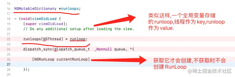 RunLoop保存在一个全局的Dictionary里,线程作为key,RunLoop作为value