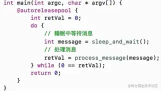 而我们iOS项目的main函数里面都有UIApplicationMain(argc, argv,nil, appDelegateClassName);这个代码,这里就是创建了一个主线程的RunLoop,所以我们程序不会退出,一直在运行中.我们可以大致写一下main函数里面的伪代码如下: