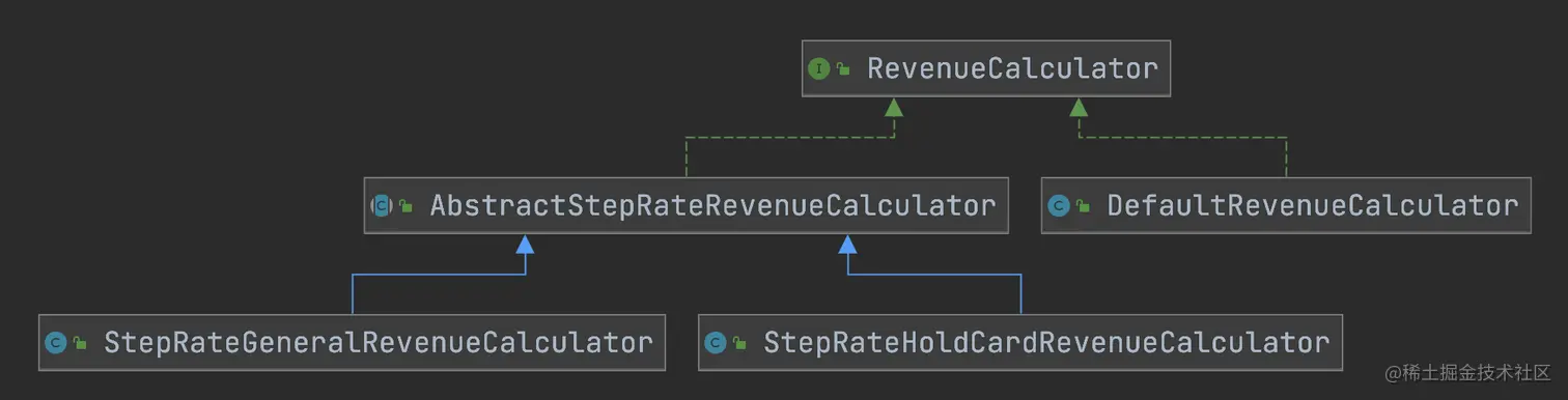 当然这里 StepRateHoldCardRevenueCalculator 和 StepRateGeneralRevenueCalculator 有抽象相同的业务逻辑,也可以抽出来一层工厂方法。