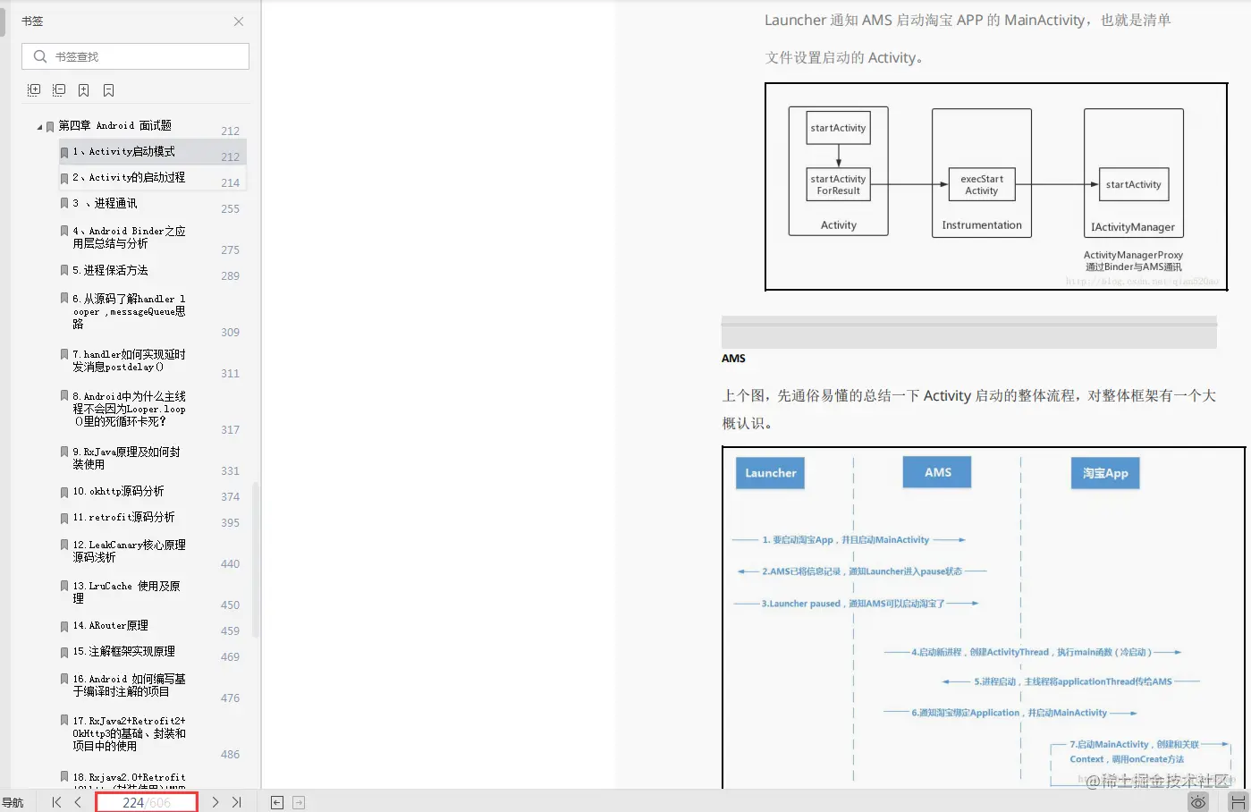 1、Activity启动模式 2、Activity的启动过程 3 、进程通讯 4、Android Binder之应用层总结与分析 5.进程保活方法 6.从源码了解handler looper ,messageQueue思路 7.handler如何实现延时发消息postdelay() 8.Android中为什么主线程不会因为Looper.loop()里的死循环卡死? 9.RxJava原理及如何封装使用 10.okhttp源码分析 11.retrofit源码分析 12.LeakCanary核心原理源码浅析 13.LruCache 使用及原理 14.ARouter原理 15.注解框架实现原理 16.Android 如何编写基于编译时注解的项目 17.RxJava2+Retrofit2+OkHttp3的基础、封装和项目中的使用 18.Rxjava2.0+Retrofit+Okhttp(封装使用)+MVP框架搭建 19.Android 插件化和热修复知识梳理 20.Android开发中比较常见的内存泄漏问题及解决办法 21.如何检测和定位Android内存泄漏 22.图片占据的内存算法 23.为什么图片需要用软引用,MVP模式中的view接口用弱引用 24.基于DataBinding与LiveData的MVVM实践 25.App稳定性优化 26.App启动速度优化 27.App内存优化 28.App绘制优化 29.App瘦身 30.网络优化 31.App电量优化 32.安卓的安全优化 33.为什么WebView加载会慢呢? 34.如何优化自定义View
