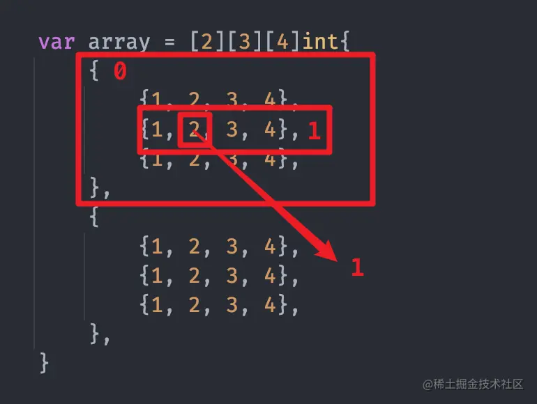 我们拿三维数组举例,第一个 [] 内的数字表示最外层数组的长度,往后以此类推。[2][3][4]int 表示最外层数组长度为 2,第二层数组长度为 3,最内层数组长度为 4。其赋值方式也和一维数组一样,只是多维数组需要将多个 {} 进行嵌套。
