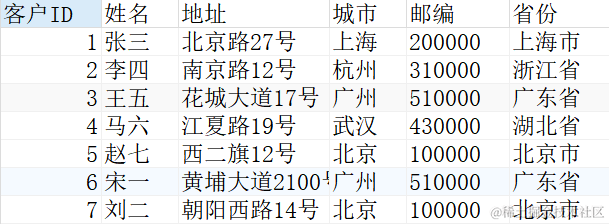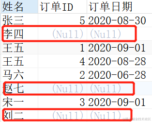 我们发现刘二,李四,赵七没有对应的订单ID和订单日期,是因为他们没有在订单表Orders中存在,没有匹配上他们的信息。但是由于是左连接,就把主表Customers的信息全部显示出来了,就是对应上图的table1。