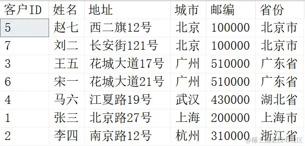 这里排序方式默认是升序。这里排序规则,是按照省份里的拼音首字母的ASCII规则排序的。例如北京市首字母是B,广东省的首字母是G,湖北省的首字母是H,上海市的首字母是S,浙江省的首字母是Z。排序后就是上述结果了,如果排序的首字母相同,则比较第二位字母,依次类推。