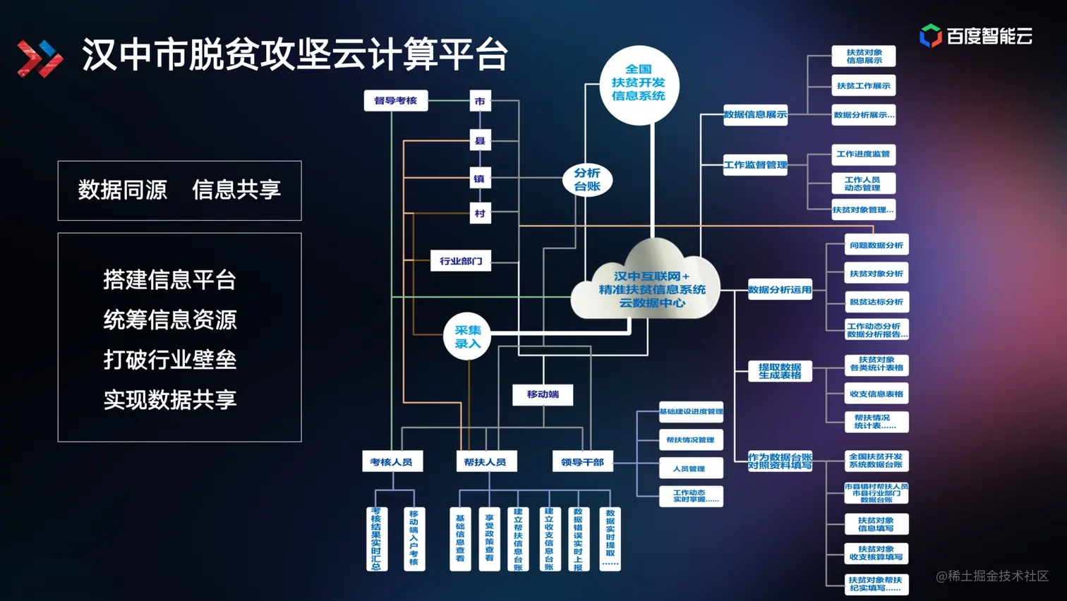 “我们在工作中发现了很多问题,比如基层工作效率不高、贫困人口识别不精准、填表造册多、工作难实时共享等。刚开始扶贫的时候他们称我们为‘表哥’、‘表姐’,因为我们整天在填表。我们后来推出了汉中市脱贫攻坚云计算平台,核心思想是数据同源、信息共享,用到云计算、百度AI智能技术。”