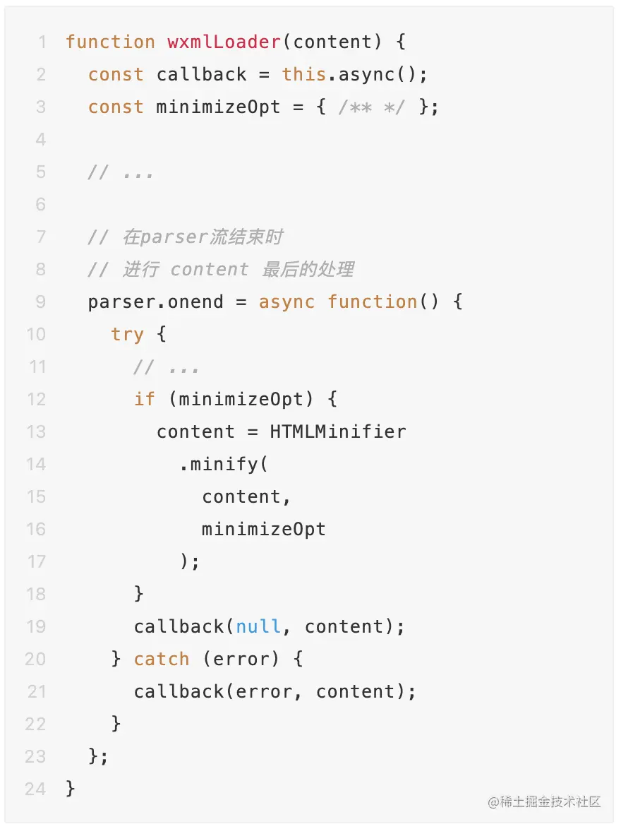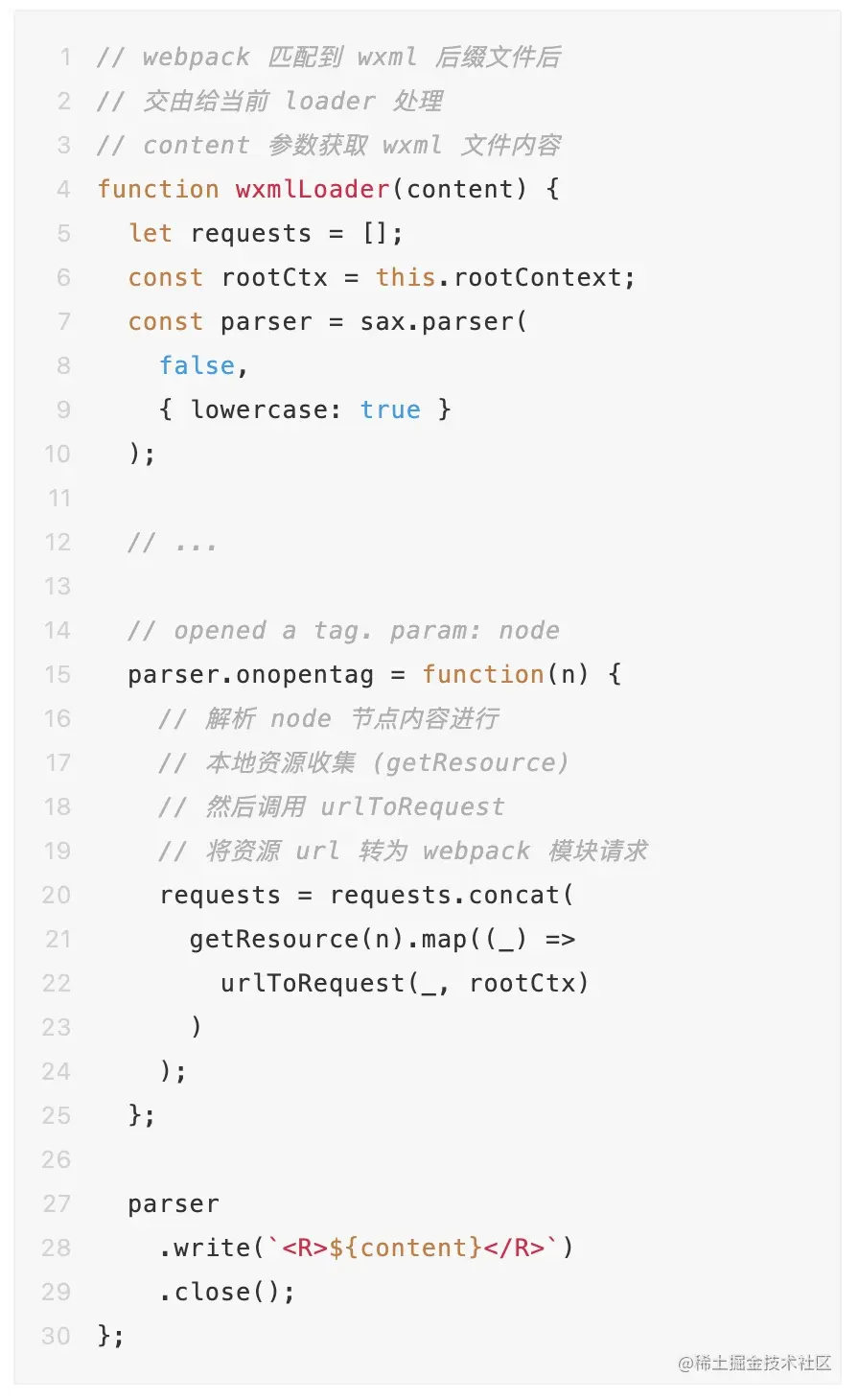 今天我们的目标是编写一个真实可用的 wxml-loader,这个 loader 主要用于收集 wxml 中的本地资源,比如图片,然后就可以交由 file-loader 来进行文件的处理;以及支持输出压缩后的 wxml 文件,减少文件大小。