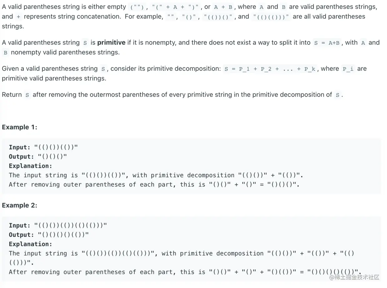 方法: 遍历字符串,统计左括号和右括号的数量,当统计到左右括号数量相等时保存内部子串即去除了最外部的括号,遍历完成可得结果。