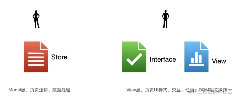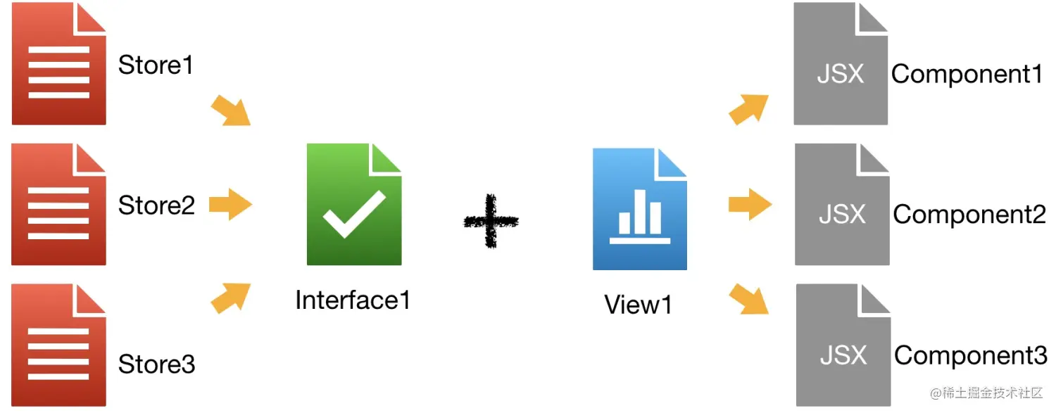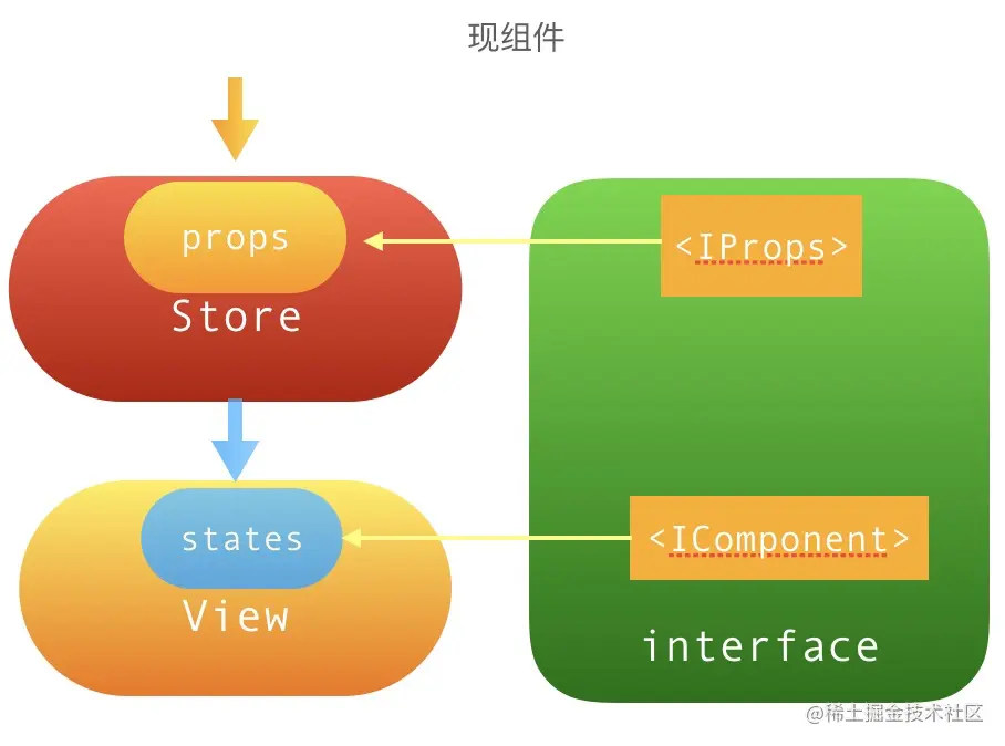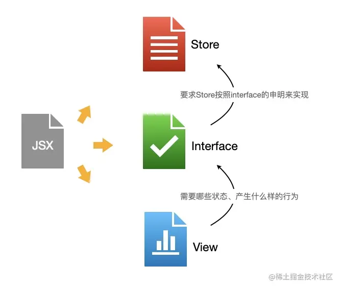 所以我们将面向组件的开发模式分为UI层View和逻辑层Store,以Interface进行隔离和耦合。