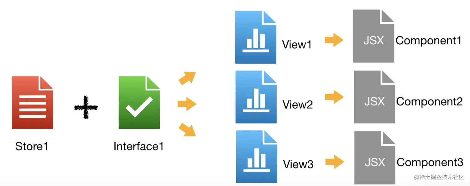 View和Store相对独立没有强耦合性,这样的好处显而易见: • 通过阅读Interface就能知道Store/View的基本逻辑,减少理解成本 • 数据逻辑和View逻辑分别在Store和View中管理,真正实现各司其职,减少维护成本。 • 最重要的一点是通过分离让Store和View分别实现了复用,组合不同的Store/View生成不同的组件 图八:Store分别和不同的View组合