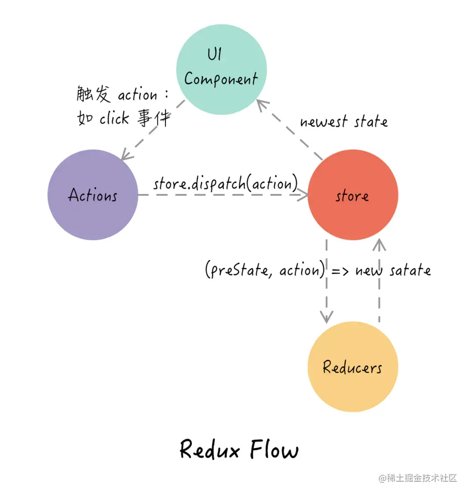 对于状态管理react体系中最受欢迎的应是redux与mobx 图三:Redux Flow