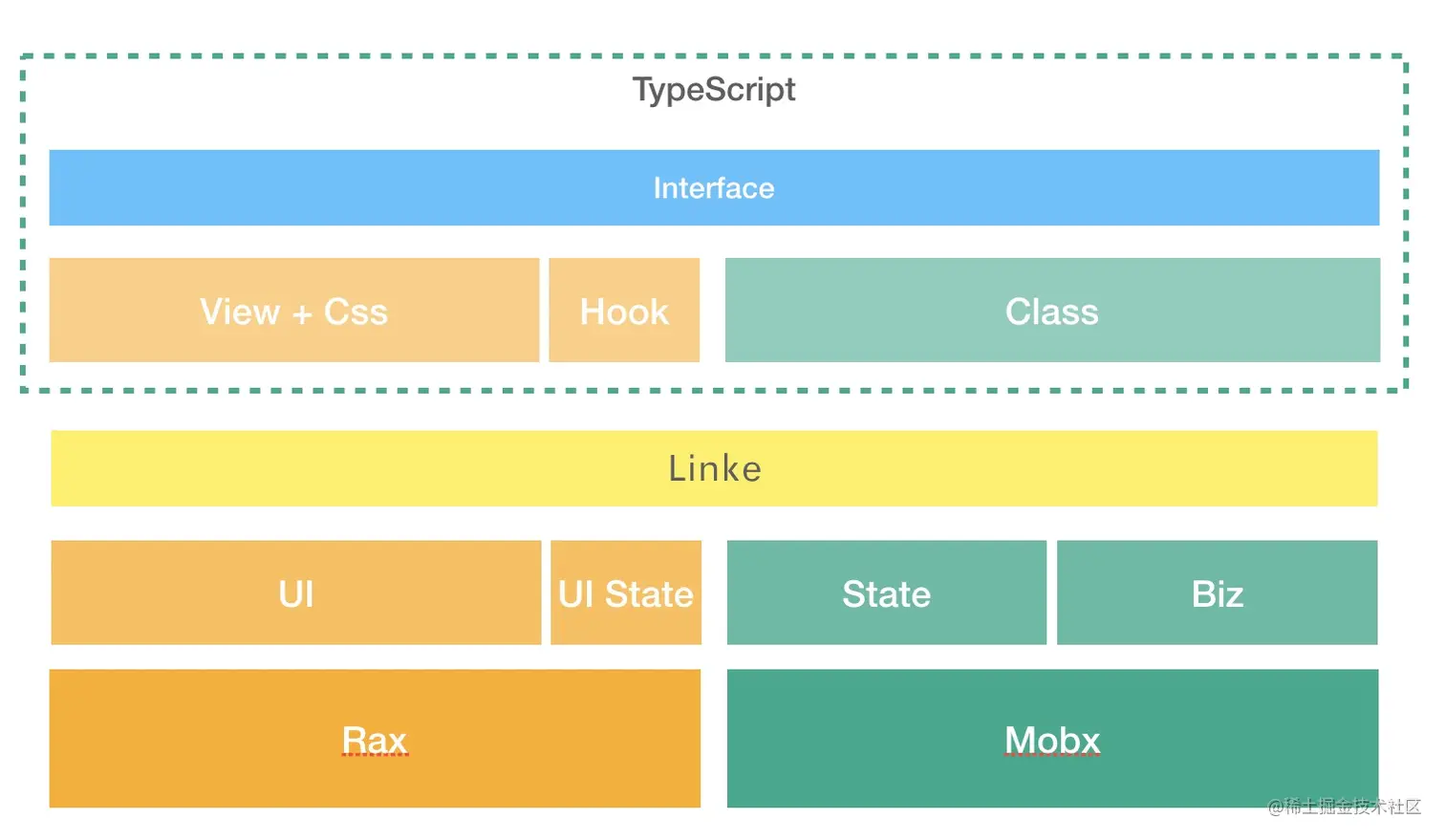 我们给框架取名:Linke,来自switch的游戏塞尔达,希望它能像林克一样点亮一个个神庙。 基于上面的分析思路结合实际业务中的技术体系(Rax)最后我们设计了下面的研发体系: UI部分也就是View还是沿用原有的Rax,UI用到的状态也直接在View中管理。 业务逻辑部分也就是Store用Mobx的能力解决上面提到的现有hooks开发遇到的问题,两者没有强关联。 Linke做为中间耦合层对他们进行约束和桥接。 图五:基于Linke的研发体系