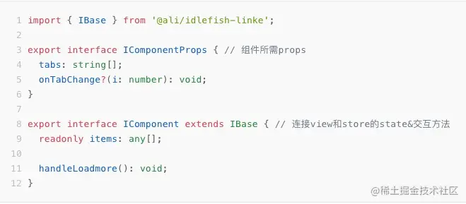 在确认了分层的逻辑后自然就引入了Interface,主要分为两部分:一部分是IProps,申明该组件所需的Props,在使用者调用该组件时进行对应的提示和约束;另一部分则负责连接Store和View,其中包括状态state和交互方法;见下面的Interface示例: