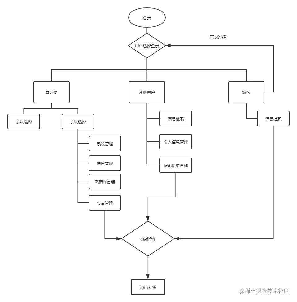 游客用户则是可以实现除问答操作外的大部分操作,包括浏览文章,问答查询,问题库浏览,作者查看等等。功能操作完成需求达成后,退出系统。