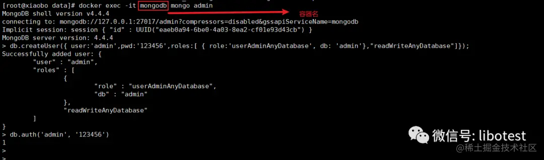 > db.createUser({ user:'admin',pwd:'123456',roles:\[ { role:'userAdminAnyDatabase', db: 'admin'},"readWriteAnyDatabase"\]});