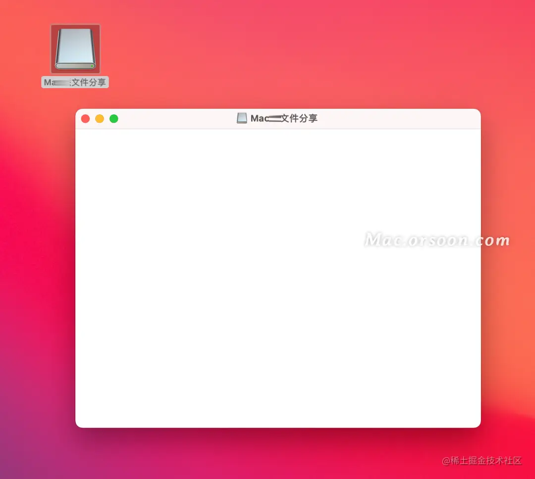 双击打开,如果这个 dmg 文件被我们设置了密码,需要先输入密码才能打开。打开后,在 macOS 桌面就会加载出一个磁盘图标。打开里面是空的。因为我们创建的是一个空映像文件。