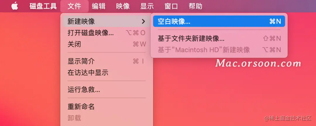 在「磁盘工具」的顶部菜单栏选择「文件」-「新建映像」-「新建空白映像」。