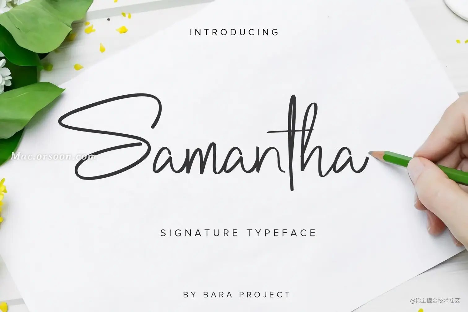 流畅手写脚本字体Samantha它非常适合您即将出现的项目,例如豪华徽标和品牌,优雅的社论设计,杂志,时尚促销,精品品牌,文具设计,博客设计,现代广告设计,名片邀请,艺术品报价,家居装饰,书籍/封面标题,特别活动以及您能想到的任何其他项目。