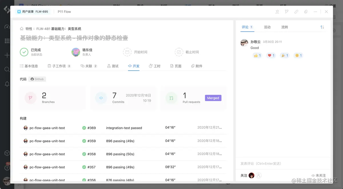 **在PingCode中,一个用户故事既承载着一个业务价值点,也是一个沟通的平台。**在一个用户故事上可以看到非常多的信息,比如一些基本信息,包括:状态、负责人、关注人、开始结束时间、优先级、风险、故事点、需求来源、需求类型、发布版本、标签、描述、自定义字段等等;还有一些关联信息,包括:子任务、缺陷、关联工作项、关联测试用例、关联文档、关联附件等等;还有一些开发数据,包括:代码提交记录、评审记录、构建记录、部署记录等等;还有一些交互数据,包括:评论、卡片的活动记录、状态流转记录等等。可谓是一张卡片,全纬度的数据。