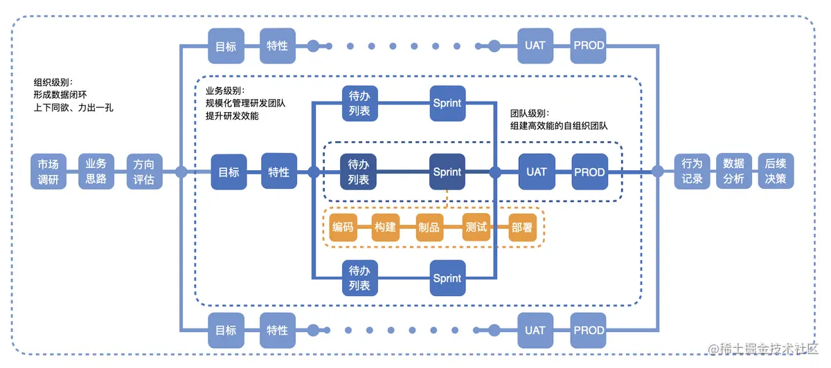 随后我们将所有的Scrum团队完成的服务进行集成,形成一个全局版本,部署到生产环境中,这个阶段对应着”规模化敏捷“图中的”PROD“节点。
