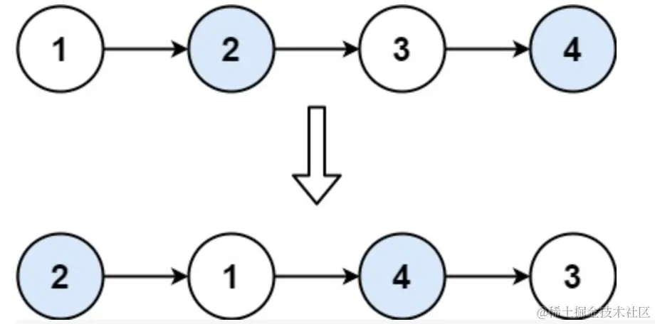 给定一个链表,两两交换其中相邻的节点,并返回交换后的链表。