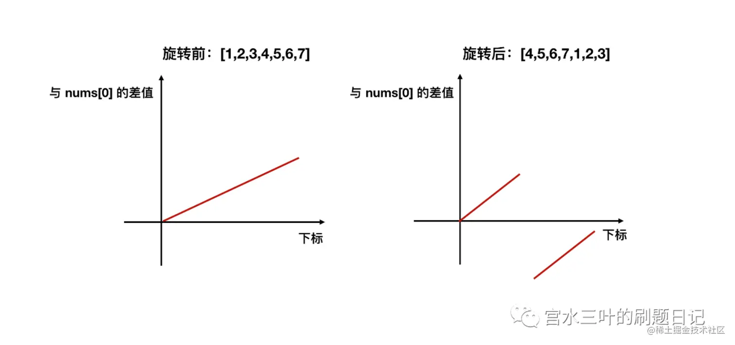 经过旋转的数组,显然前半段满足 >= nums[0],而后半段不满足 >= nums[0]。我们可以以此作为依据,通过「二分」找到旋转点。