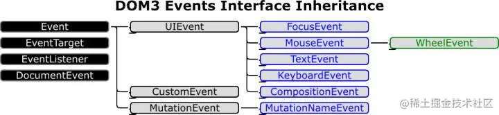 我们已经知道,事件的回调函数中有个事件对象的参数。从第一部分,我们已经看到Event对象的继承关系,比如我们最常见的鼠标事件或者键盘事件,MouseEvent继承自UIEvent,UIEvent继承自Event。我们参考最新的W3C规范,来具体看下。