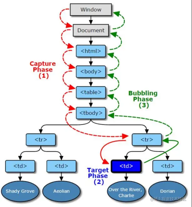 1. 事件捕获阶段(capture phase),就是事件从window开始一层一层向目标传递的阶段 2. 目标阶段(target phase),当事件到达事件发生现场的阶段 3. 事件冒泡阶段(bubble phase),和事件捕获阶段相反,事件从目标到window传递的阶段