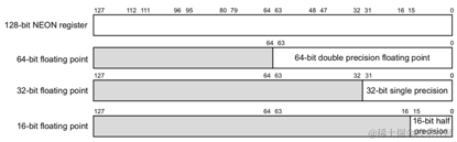 - AArch64 NEON提供了对双精度浮点和完整IEEE754操作的支持,其中包括舍入模式,非规范化数和NaN处理。