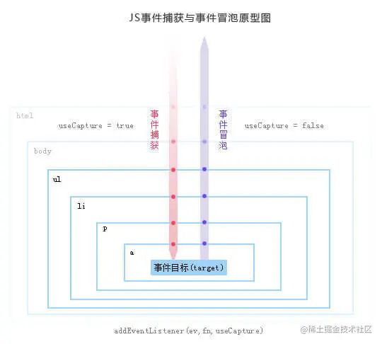 - 目标阶段:目标阶段就是指事件响应到触发事件的最底层元素上;