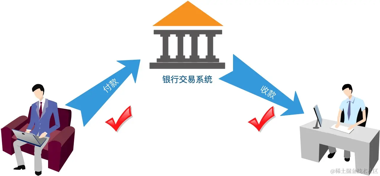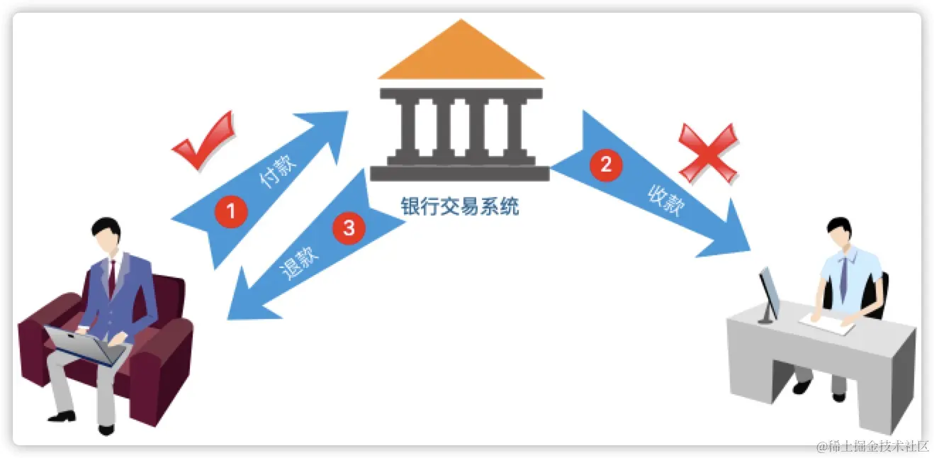 在整个过程中,两个环节必须同时成功,如果收款方入账失败,那么款项应该被退回到付款方,否则一定无法平账。那么整个交易过程就可以被看做一个事务,如果成功那么两个环节都不能出现问题,如果任何一个环节出现问题,那么就要将整个操作全部还原。