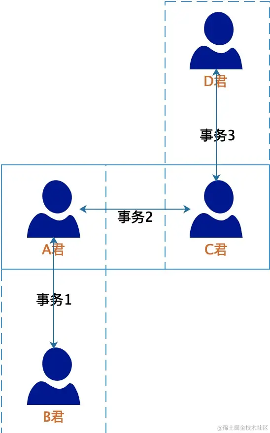 在事务概念中,我们已经可以知道,一个事务中会包含多个操作,那么最常见最经典的案例就是转账操作,由于每个人各自有自己的账户,所以一定会被划分成两个阶段: