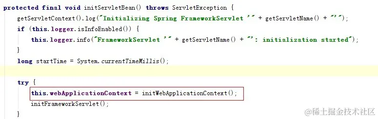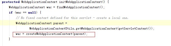 注意代码:initServletBean(); 其余的都和加载bean关系并不是特别大,跟踪进去会发I发现这个方法是在类:org.springframework.web.servlet.FrameworkServlet类中(是DispatcherServlet的父类、HttpServletBean的子类),内部通过调用initWebApplicationContext()来初始化一个WebApplicationContext,源码片段(篇幅所限,不拷贝所有源码,仅仅截取片段)
