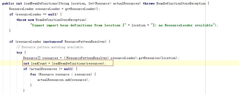 AbstractBeanDefinitionReader.loadBeanDefinitions(Resources []) 循环Resource数组,调用方法: