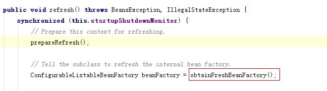 AbstractApplicationContext,这个类中的refresh() 方法是共用的,也就是他们都调用的这个方法来加载bean的,在这个方法中,通过obtainFreshBeanFactory方法来构造beanFactory的,如下图所示: