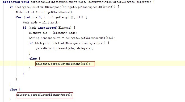 中间有解析XML的过程,但是貌似我们不是很关心,我们就关系类是怎么加载的,虽然已经到XML解析部分了,所以主要看parseBeanDefinitions这个方法,里面会调用到BeanDefinitionParserDelegate类的parseCustomElement方法,用来解析bean的信息: