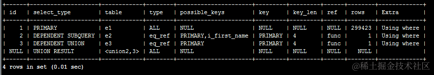E:union result:包含union的结果集,在union和union all语句中,因为它不需要参与查询,所以id字段为null