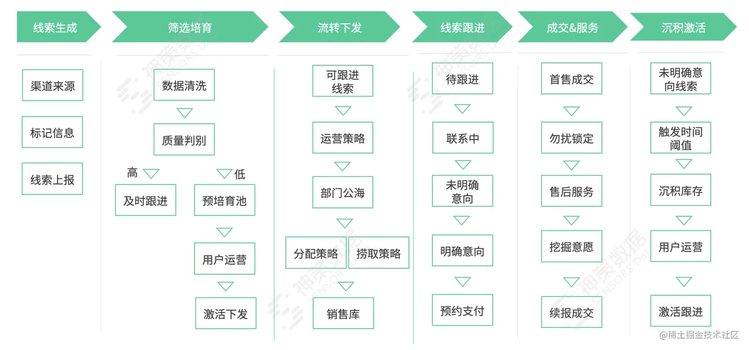 线索培育与用户运营密不可分,这是一个把小鱼养大的过程,需要用户运营人员在将线索转给销售团队跟进之前,把线索转化为满足销售跟进的高质量线索,这个过程需要运营团队和销售团队的紧密配合。