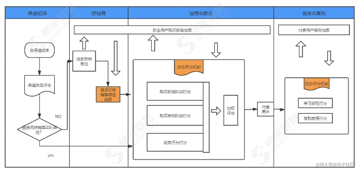 (3)培育 & 跟进。此阶段的线索是满足可跟进状态的线索,用户购买旅程的运营策略要配合销售的跟进流程,核心目的是促使客户成单。这个阶段的线索质量好坏不是一成不变的,随着客户心理、对产品和环境的认知程度的变化而变化,并通过用户行为反馈出来,此时可以通过动态评分模型将其量化,此阶段评分模块需要考虑用户的购买旅程阶段、销售跟进的购买意向阶段、线索行为评分。
