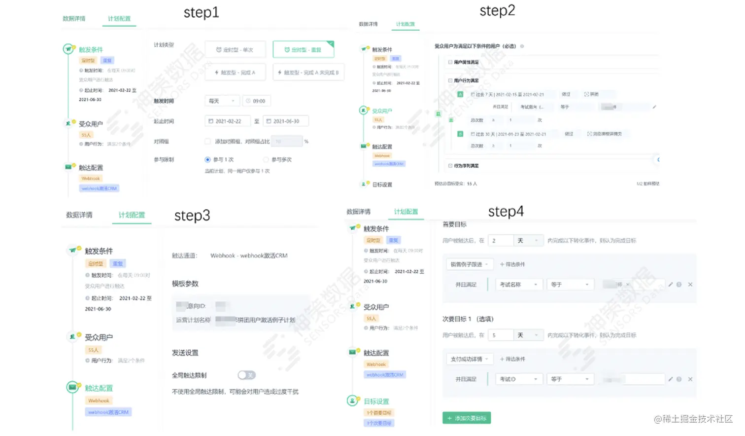 (2)策略配置举例 Step1:设定触发条件,需要设定的参数包括:计划类型(定时单次、定时重复、触发型)、触发时间、起止时间、对照组占比等。