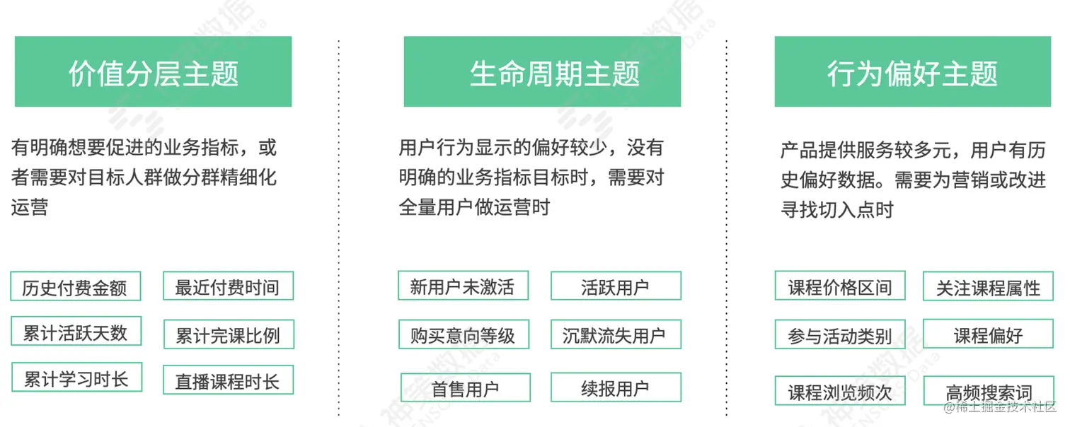 线索标签体系搭建要依托企业售卖商品特性、用户运营体系、营销特点,在线教育场景下的标签体系搭建可以参考下图,从价值分层、生命周期、行为偏好三个主题展开。