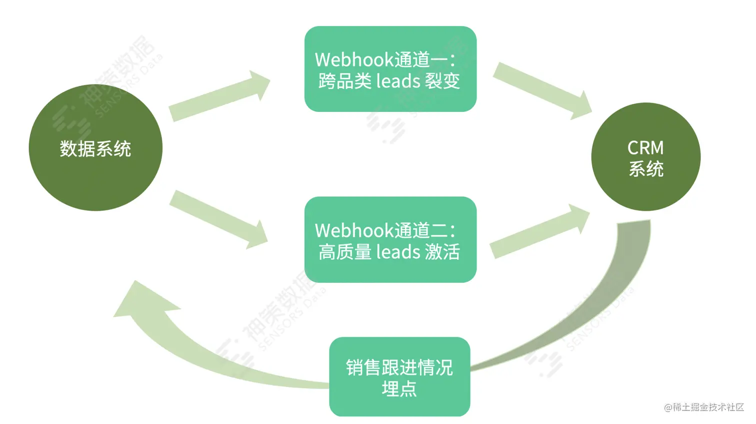 ③ Webhook2:高质 leads 激活通道,通过运营策略的执行来不断影响培育线索,直到线索触发高意向行为,达到可跟进条件,就通过此通道激活下发让销售跟进。
