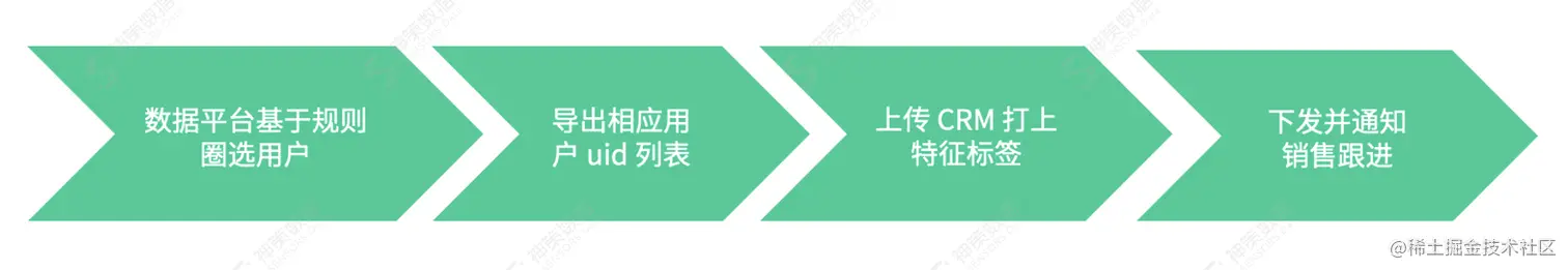 线索预培育和激活跟进在系统功能不具备的情况下可以通过运营人员人工操作的方式先跑起来,具体流程如下图: 运营人员在数据平台基于规则圈选预培育池中具备销售跟进特征的用户,导出圈选用户的 uid 列表,人工上传 CRM 系统并打上相应的特征标签标识这部分用户,通过 CRM 的数据流转机制分配给合适销售跟进。