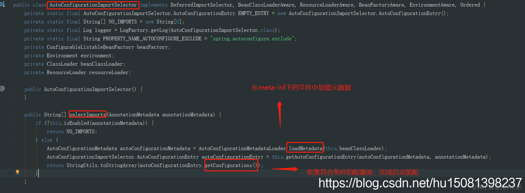 基于前面的分析,大家可以猜想到,自动装配的核心是扫描约定目录下的文件进行解析,解析后将得到的Configuration配置类通过ImportSelector进行导入,完成Bean的自动装配。那么我们下面仔细分析下AutoConfigurationImportSelector中的selectImport方法