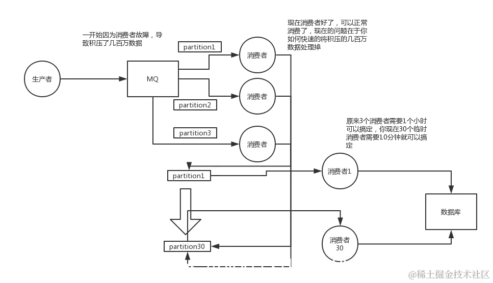 这个是我们真实遇到过的一个场景,确实是线上故障了,这个时候要不然就是修复consumer的问题,让他恢复消费速度,然后傻傻的等待几个小时消费完毕。这个肯定不能在面试的时候说吧。