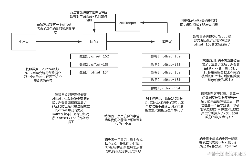 还有比如基于数据库的唯一键来保证重复数据不会重复插入多条,我们之前线上系统就有这个问题,就是拿到数据的时候,每次重启可能会有重复,因为kafka消费者还没来得及提交 offset ,重复数据拿到了以后我们插入的时候,因为有唯一键约束了,所以重复数据只会插入报错,不会导致数据库中出现脏数据