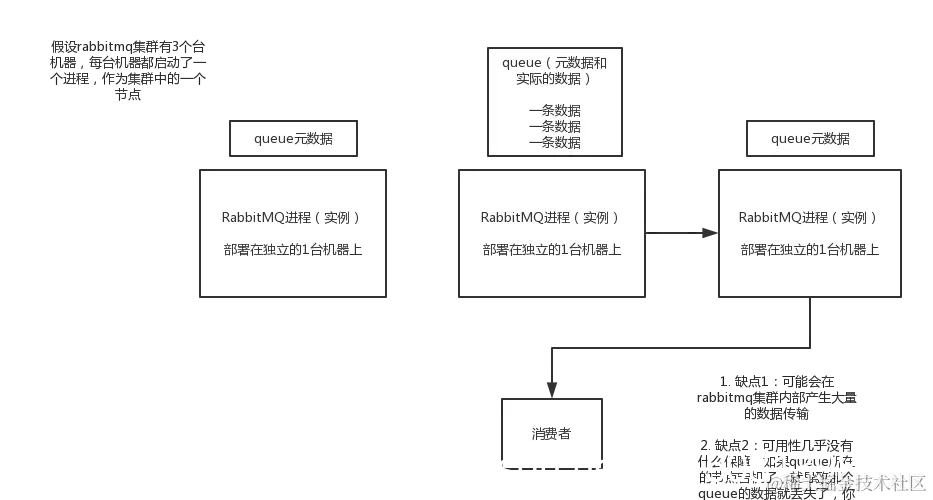 意思就是在多台机器上启动多个rabbitmq实例,每个机器启动一个。但是你创建的 queue ,只会放在一个 rabbtimq 实例上,但是每个实例都同步 queue 的元数据。完了你消费的时候,实际上如果连接到了另外一个实例,那么那个实例会从 queue 所在实例上拉取数据过来。
